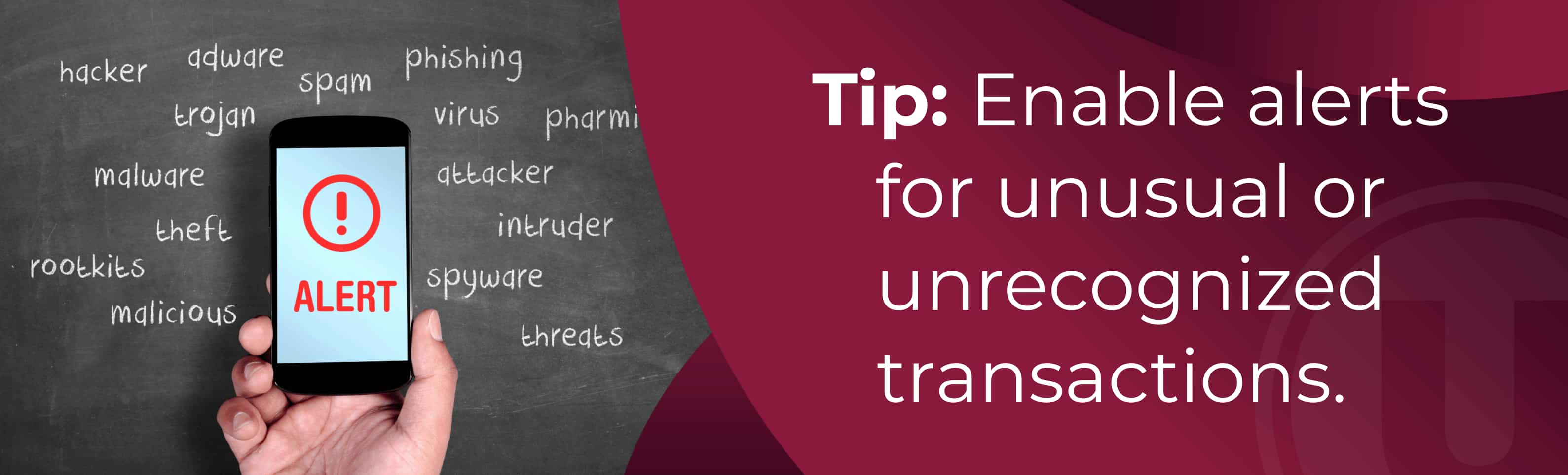One of the many benefits of mobile and online banking is that you can check your accounts regularly to look for signs of fraud. If you see any reason to be suspicious, report this to Union Bank immediately. Frequently checking your financial accounts can help you avoid a loss.